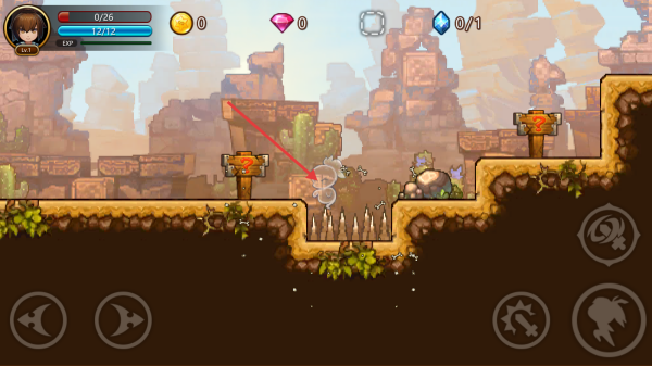 3、前行時,看到尖刺陷阱,提前操控角色跳躍躲避,避免受傷,繼續(xù)向目標前進。