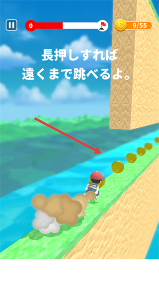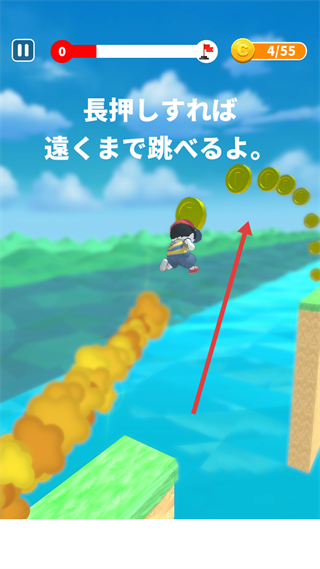 2、長(zhǎng)按屏幕操控角色跳躍,收集金幣資源,同時(shí)跨越河道障礙物,推進(jìn)關(guān)卡進(jìn)度。