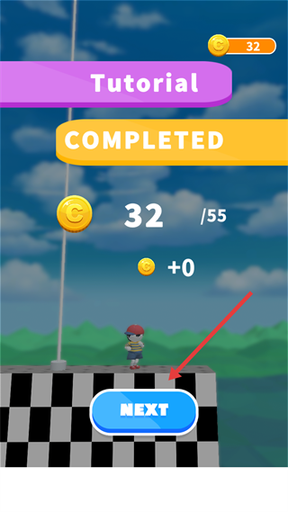 4、教程關(guān)卡完成后,點(diǎn)擊NEXT按鈕,進(jìn)入下一關(guān)繼續(xù)挑戰(zhàn),提升跳躍和金幣收集技巧。