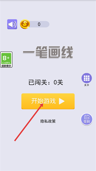 1、點擊黃色【開始游戲】按鈕,進入“一筆畫線”游戲,開啟關(guān)卡挑戰(zhàn)。