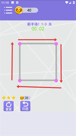 4、進入【新手場1-3關(guān)】,根據(jù)紅色箭頭提示的方向,規(guī)劃路徑連接四個粉色節(jié)點,完成一筆畫。