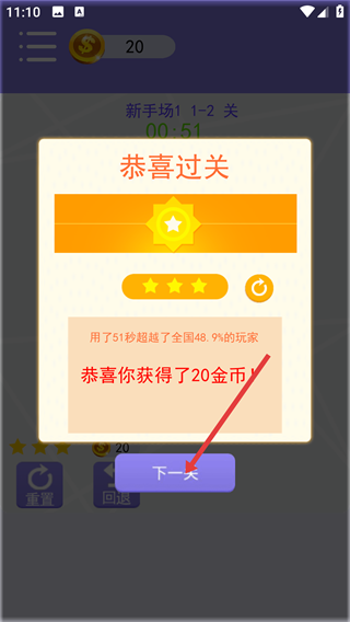 3、過關(guān)后界面顯示【恭喜過關(guān)】,獲得20金幣,點擊紫色【下一關(guān)】按鈕,挑戰(zhàn)后續(xù)關(guān)卡。