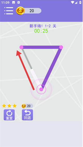2、進入【新手場1-2關(guān)】,按照紅色箭頭指引,拖動線條連接粉色節(jié)點,完成當(dāng)前一筆畫任務(wù)。