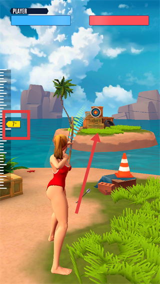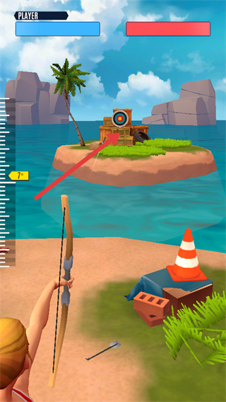 2、注意左側(cè)標(biāo)尺的角度數(shù)值(如【7°】),調(diào)整射擊角度,瞄準(zhǔn)【靶心】拉弓準(zhǔn)備射擊。