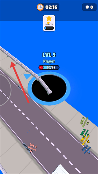 2、操控黑洞吞噬橋梁等大型物體,提升等級至【LVL5】,同時(shí)留意時(shí)間【02:16】,高效利用每一秒成長。