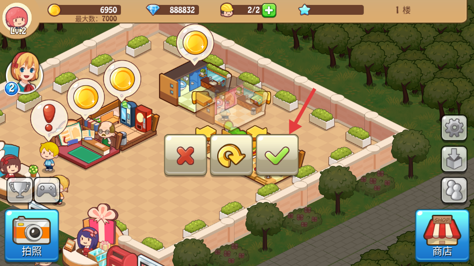 3、回到商場(chǎng)布局界面,調(diào)整新店鋪位置后點(diǎn)擊綠色對(duì)勾按鈕,確認(rèn)放置。