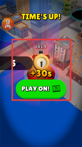 4、時間結(jié)束時,點擊【PLAYON!】按鈕可直接獲得【+30s】額外時間,無需看廣告,繼續(xù)吞噬沖擊更高等級。