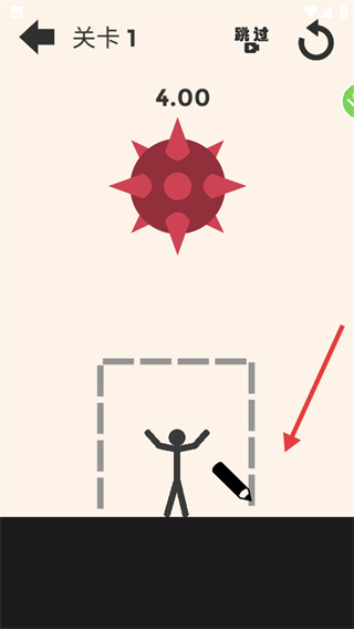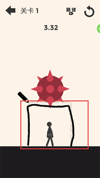 2、在【關(guān)卡1】里,按照虛線框范圍,用畫筆為火柴人繪制防護區(qū)域,規(guī)避尖刺球傷害。