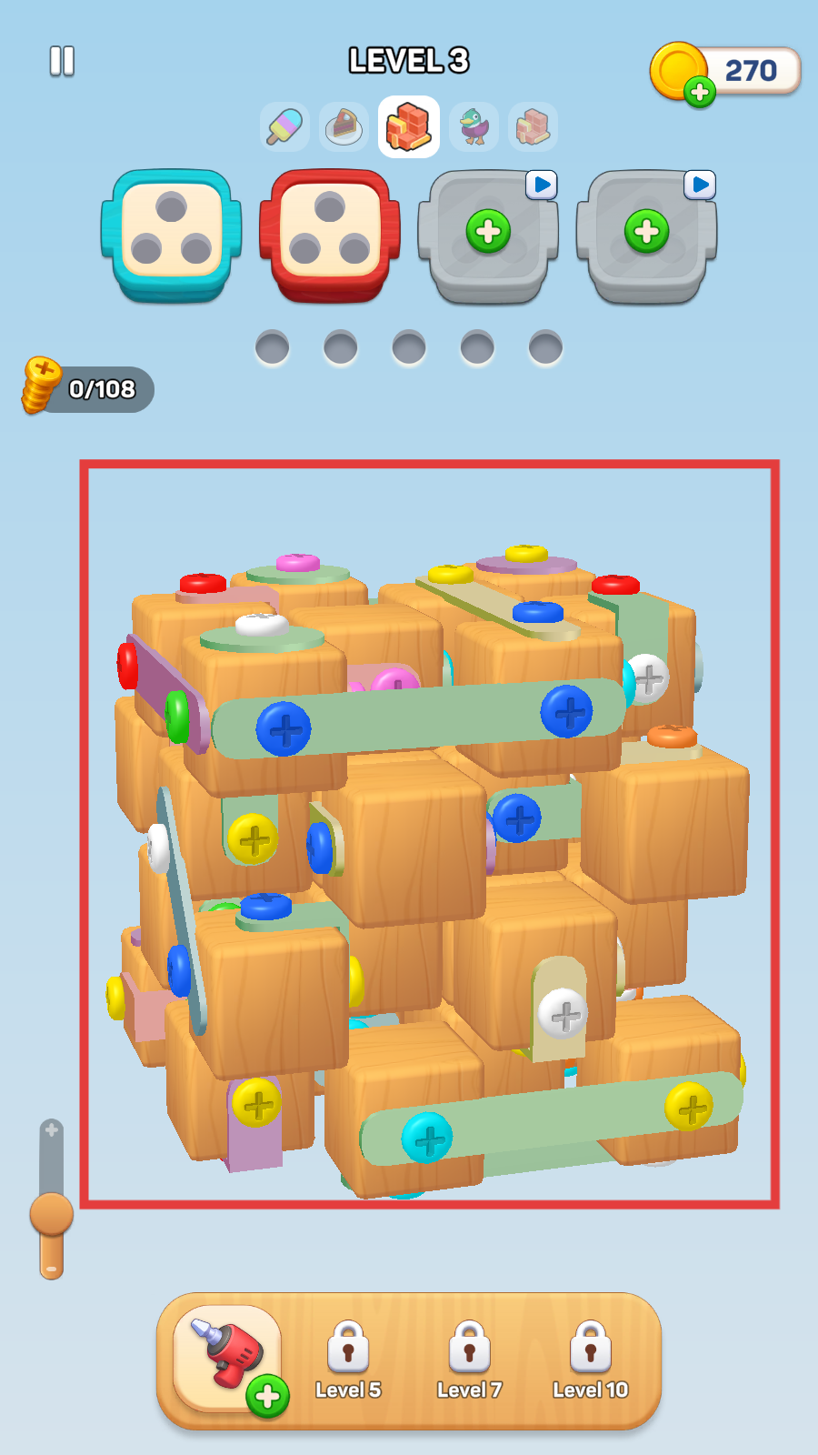 5、支持透視查看功能,長(zhǎng)按積木可顯示隱藏的螺絲顏色,為復(fù)雜關(guān)卡提供重要參考信息。