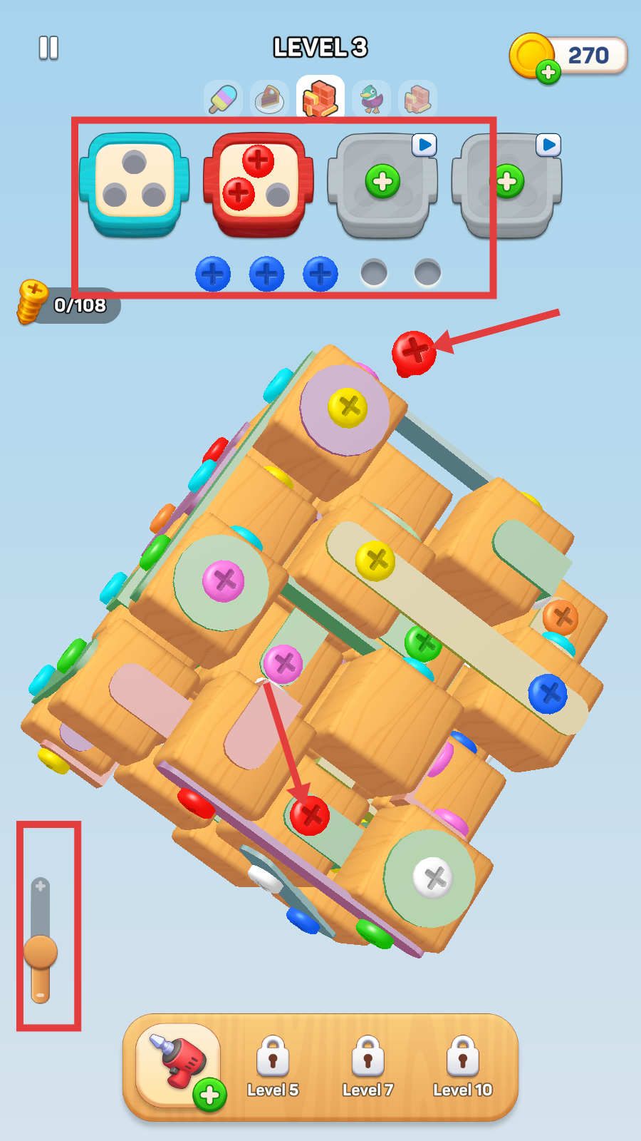1、需要密切觀察屏幕上方的顏色提示,在立體模型中精準(zhǔn)定位并點(diǎn)擊對(duì)應(yīng)顏色的螺絲進(jìn)行收集。