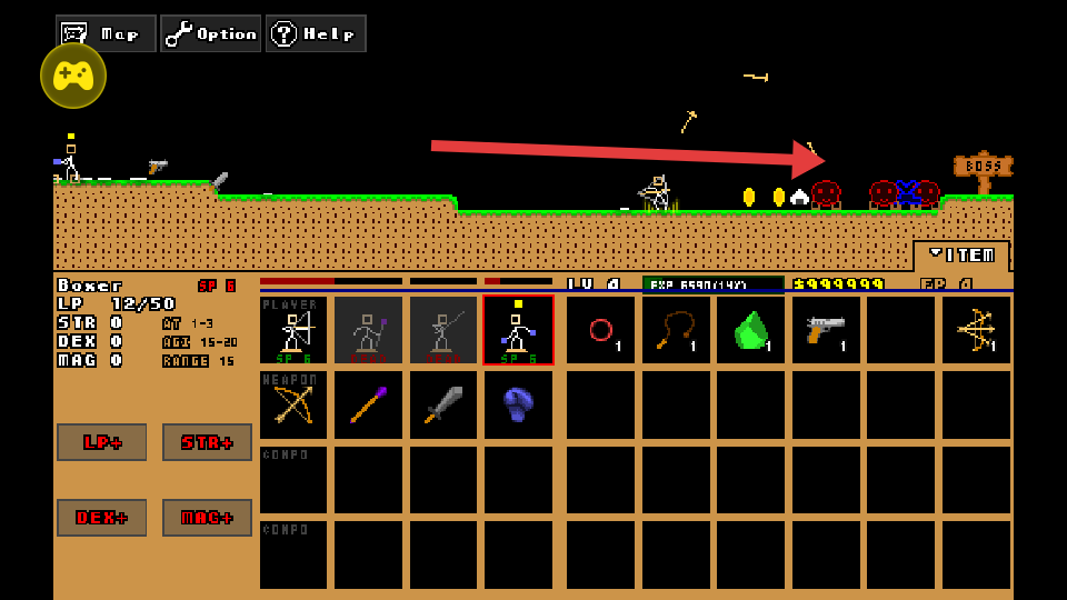 2、游戲中沿著箭頭指示方向前進,挑戰(zhàn)敵人并收集資源,提升角色實力,向BOSS區(qū)域推進。