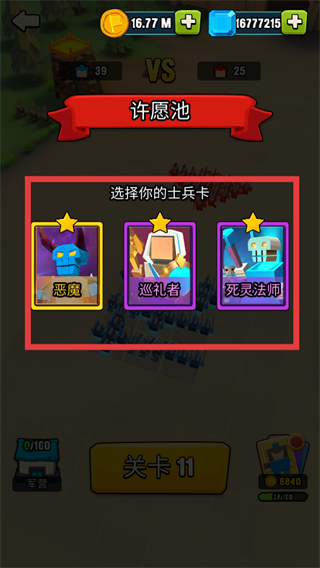 2、在許愿池界面,可選擇【惡魔】【巡禮者】【死靈法師】等士兵卡,豐富兵種選擇,增強(qiáng)戰(zhàn)力。
