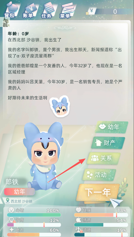 1、進(jìn)入游戲后,點(diǎn)擊【關(guān)系】按鈕,可查看自身家庭背景,包括父母職業(yè)、年齡等信息,這是開啟人生模擬的基礎(chǔ)一步呢。