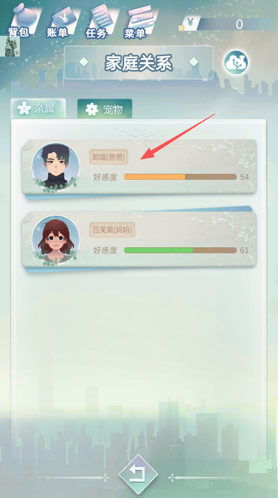 2、在【家庭關(guān)系-親屬】界面,留意父母的好感度數(shù)值,這些數(shù)值很關(guān)鍵哦,點(diǎn)擊進(jìn)入詳情頁吧。