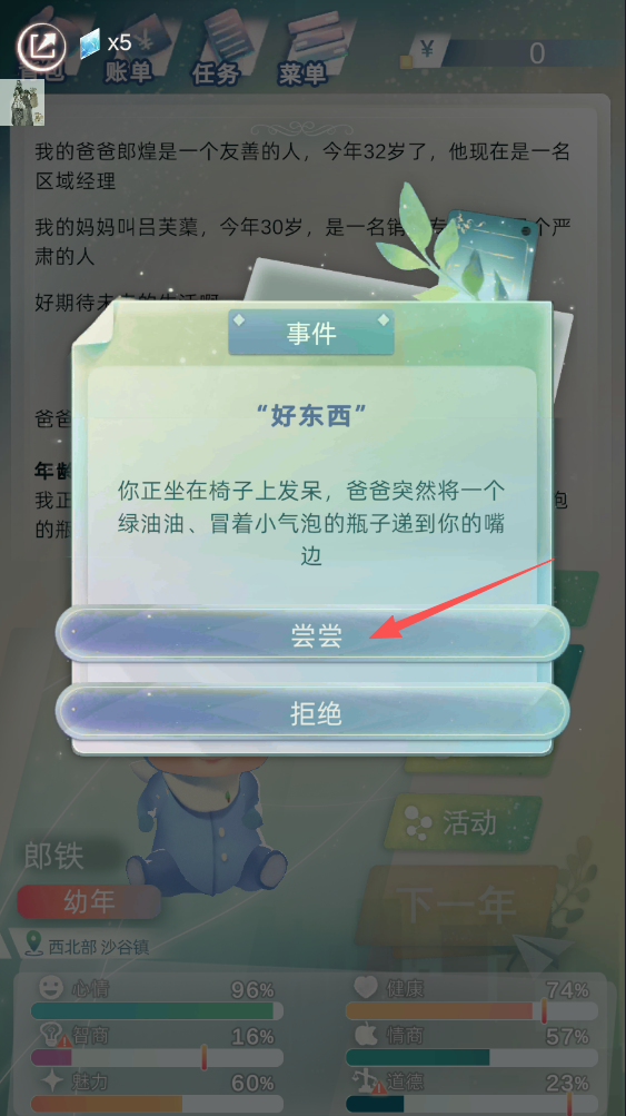 4、遇到【好東西】事件時(shí),選擇【嘗嘗】或【拒絕】會(huì)觸發(fā)不同劇情,還會(huì)影響心情、健康等屬性,咱們得好好斟酌抉擇呢。