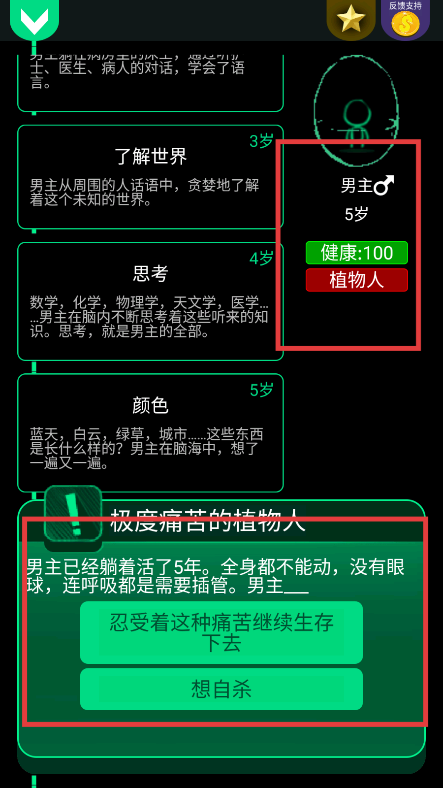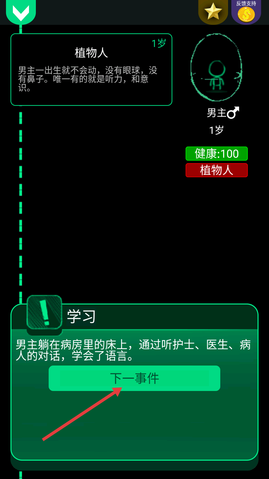 2、游戲中角色會經(jīng)歷各類人生事件,點擊“下一事件”推進(jìn)劇情,即使是植物人狀態(tài),也能通過聽覺學(xué)習(xí)語言、了解世界、思考知識。