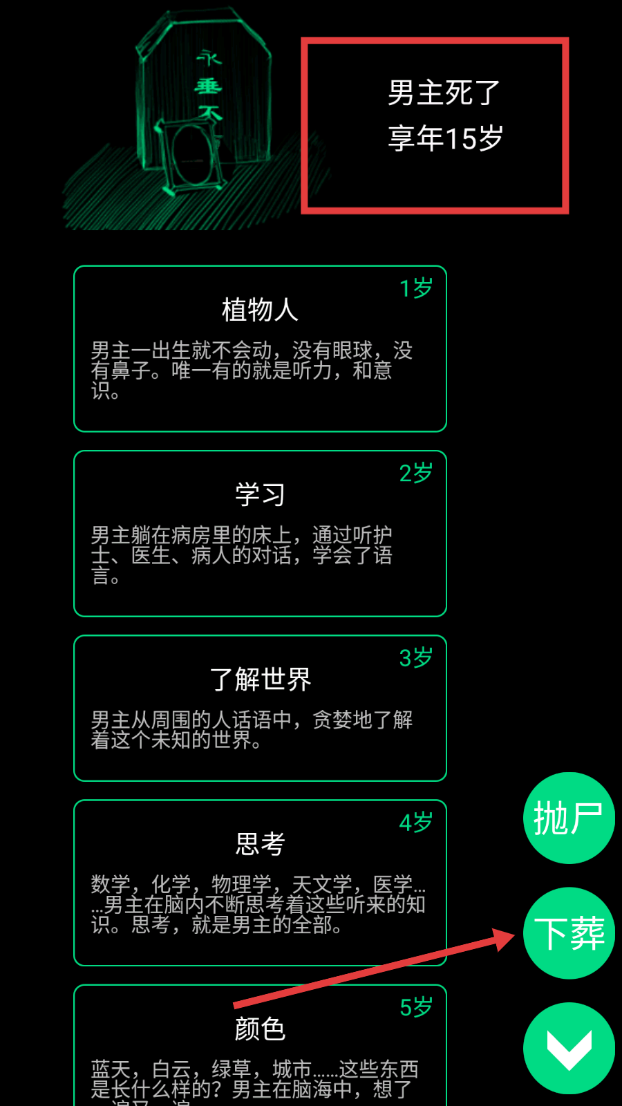 4、角色死亡后,可選擇“拋尸”或“下葬”處理,結(jié)束當(dāng)前人生,可重新創(chuàng)建角色開啟新的人生模擬。