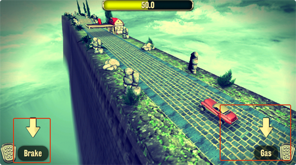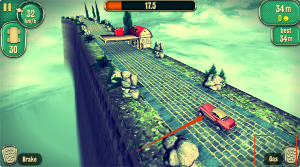 1、游戲開始時,熟悉【Brake】(剎車)和【Gas】(油門)按鈕的操作,在高空賽道上控制紅色汽車行駛,注意保持平衡。