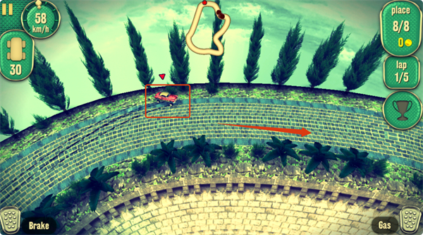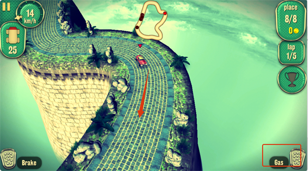 3、在環(huán)形賽道上,關注地圖和排名信息,利用【Gas】和【Brake】控制車速,在彎道處謹慎操作,提升行駛效率。