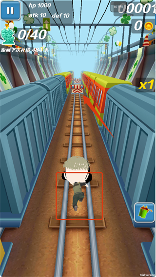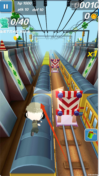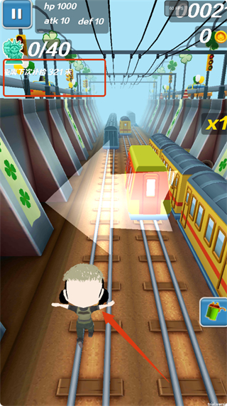 2、在跑酷過(guò)程中,注意前方火車和障礙物,利用左右移動(dòng)避開危險(xiǎn),同時(shí)關(guān)注上方屬性,了解角色狀態(tài)。