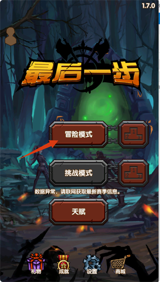 1、點(diǎn)擊【冒險(xiǎn)模式】進(jìn)入游戲,界面中【最后一步】的標(biāo)題和模式選擇提示這是一款冒險(xiǎn)類游戲,開始探索游戲世界。