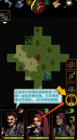 2、游戲中,按照提示點(diǎn)擊背包,管理獲得的食物和道具,及時(shí)補(bǔ)充食物,保持角色狀態(tài)良好。