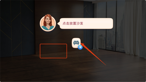 2、游戲中,按照提示【點(diǎn)擊放置沙發(fā)】,將家具放置到指定區(qū)域,開始學(xué)習(xí)室內(nèi)設(shè)計(jì)的基本操作。