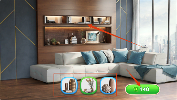 4、完成家具布置后,添加裝飾擺件,關(guān)注獲得的【140】金幣獎(jiǎng)勵(lì),逐步完善室內(nèi)設(shè)計(jì),打造理想空間。