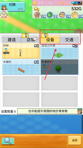 2、在建造界面選擇【設(shè)備】,可放置如【百花三葉草】等設(shè)施,這些設(shè)備有助于提升周圍地價(jià)等城市發(fā)展參數(shù)。