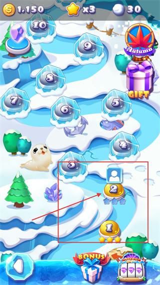 1、在關(guān)卡選擇界面,點擊帶星級標識的第2關(guān),繼續(xù)冰雪主題的寶石消除挑戰(zhàn)。