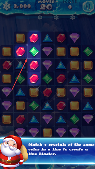 2、進入第2關(guān)后,按照提示匹配4個同色寶石可創(chuàng)建直線爆破道具,助力消除目標雪花。