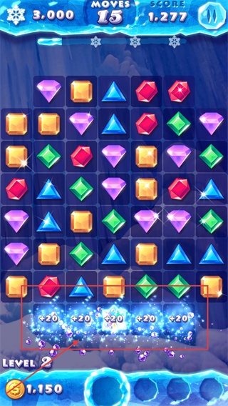 3、游戲中觸發(fā)+20獎勵的消除組合可快速積累分數(shù),注意觀察寶石布局,高效利用消除機會。