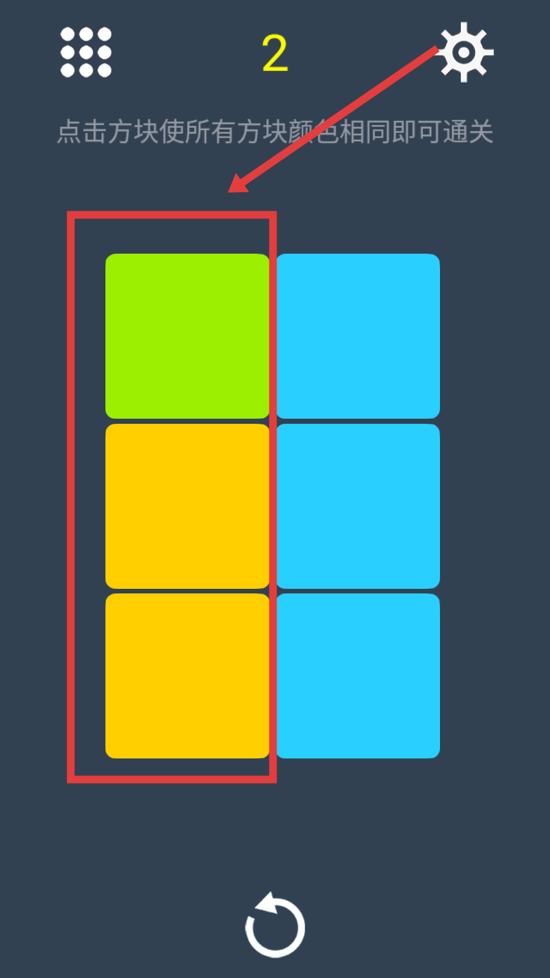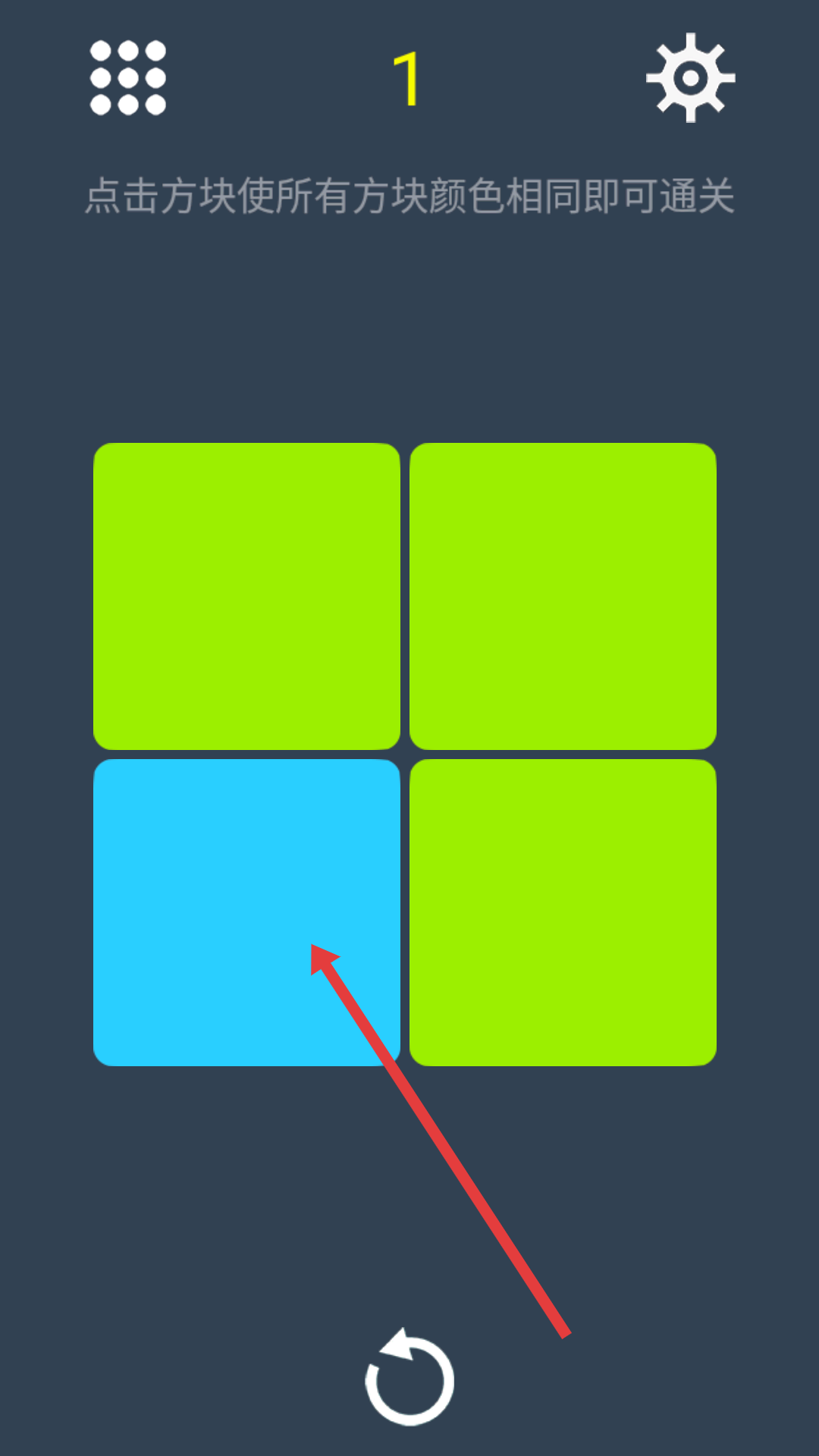 2、在第1關(guān)中,點(diǎn)擊藍(lán)色方塊,讓所有方塊顏色一致從而順利通關(guān)。
