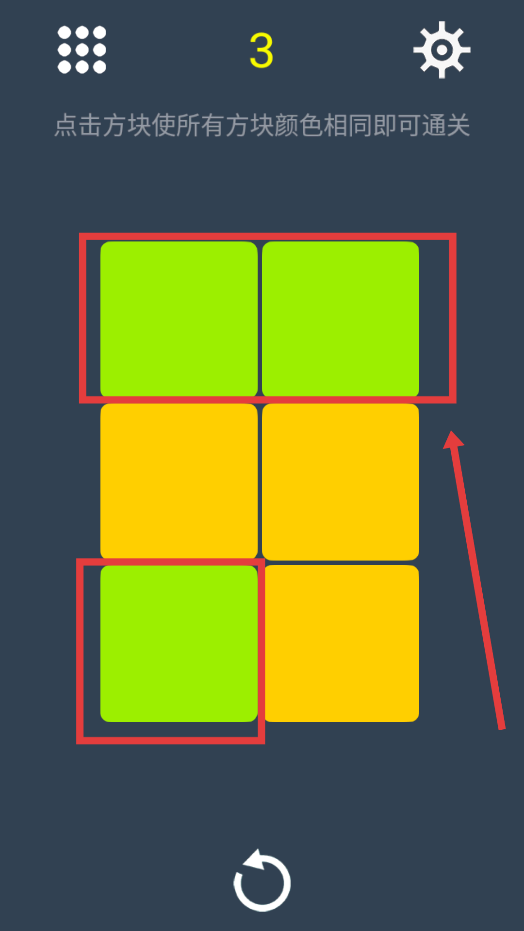 4、在第3關(guān)中,點(diǎn)擊方塊調(diào)整顏色,令所有方塊顏色相同實(shí)現(xiàn)通關(guān)。
