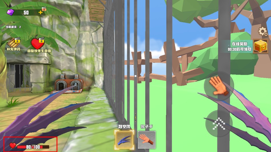 4、面對(duì)攻擊性訪客時(shí)切換【裂空爪】武器,及時(shí)反擊減少傷害,維持生命值保護(hù)猴子同伴,同時(shí)注意觀察自身血量是否安全。