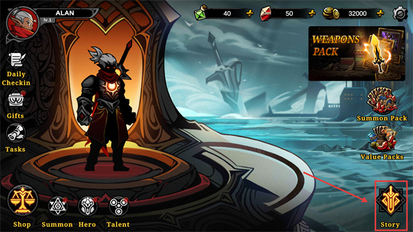 1、界面中點(diǎn)擊【Story】可了解劇情背景,同時(shí)可通過(guò)【W(wǎng)EAPONS-PACK】等禮包獲取裝備,提升角色戰(zhàn)力。