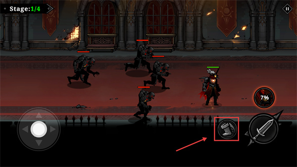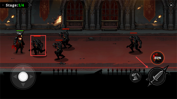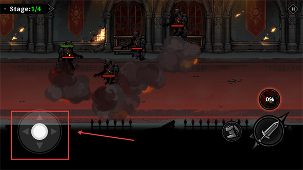 2、在【Stage:1/4】關(guān)卡中,通過(guò)左側(cè)方向按鈕操控角色移動(dòng),調(diào)整站位以應(yīng)對(duì)敵方單位的包圍。