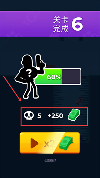 4、【關卡6】完成后,可獲得【5】擊殺數(shù)與【+250】貨幣獎勵,點擊繼續(xù)即可進入下一關積累資源。