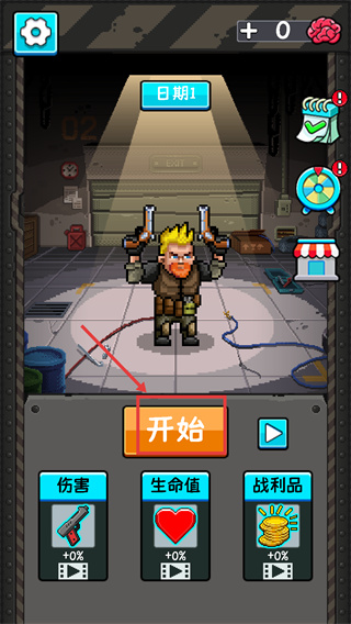 1、在【日期1】界面點(diǎn)擊【開始】進(jìn)入關(guān)卡,初始屬性【傷害-+0%】【生命值-+0%】,需優(yōu)先積累資源提升能力。