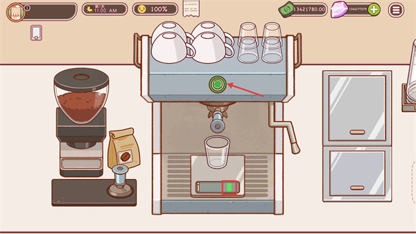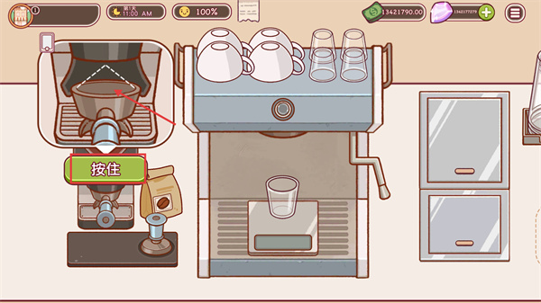 2、在制作界面中,找到研磨設(shè)備旁的【按住】按鈕并操作,可將咖啡豆研磨成粉,為后續(xù)萃取做準(zhǔn)備。