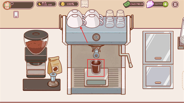4、萃取結(jié)束后,取上方置物架的杯子承接咖啡液,完成基礎(chǔ)咖啡制作,可繼續(xù)推進(jìn)后續(xù)經(jīng)營(yíng)步驟。