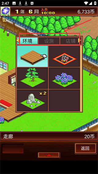 2、支持自由配置小賣部、食堂、游戲室等豐富多樣的設(shè)施,靈活組合搭配各類設(shè)施打造獨具風格的人氣旅館,玩法自由度極高。