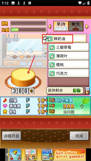 2、在裝飾環(huán)節(jié)選擇【鮮奶油】添加到主體上,可提升甜品的分量、美味度等屬性,同時(shí)消耗對應(yīng)資源。