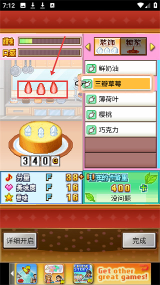 3、繼續(xù)添加【三瓣草莓】類裝飾,進(jìn)一步優(yōu)化甜品屬性,注意裝飾剩余次數(shù),合理分配裝飾材料。