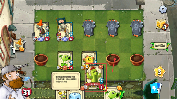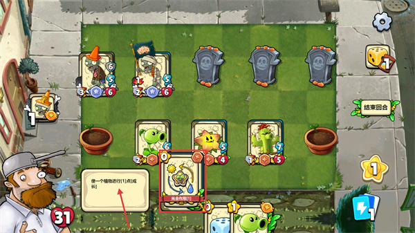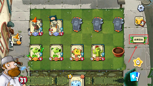 4、完成本回合部署后,點(diǎn)擊【結(jié)束回合】按鈕推進(jìn)對(duì)局,注意此時(shí)星星數(shù)會(huì)更新,需關(guān)注后續(xù)僵尸的行動(dòng)。