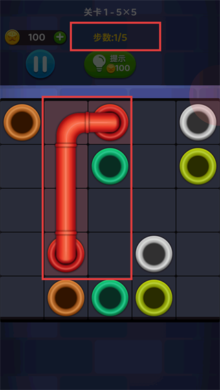 1、關(guān)卡為【1-5×5】,當前步數(shù)【1/5】,需調(diào)5種顏色的管道,使其匹配對應(yīng)顏色的圓環(huán),推進管道的連接進程。