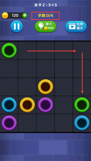 2、關(guān)卡是【2-5×5】,初始步數(shù)【0/4】,按照箭頭指引操作對應(yīng)顏色的圓環(huán)管道,開啟本關(guān)卡的管道連接準備步驟。