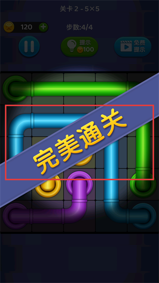 3、關(guān)卡【2-5×5】的步數(shù)達成【4/4】,管道完成對應(yīng)顏色的連接,成功達成【完美通關(guān)】,完成該關(guān)卡的拼接任務(wù)。