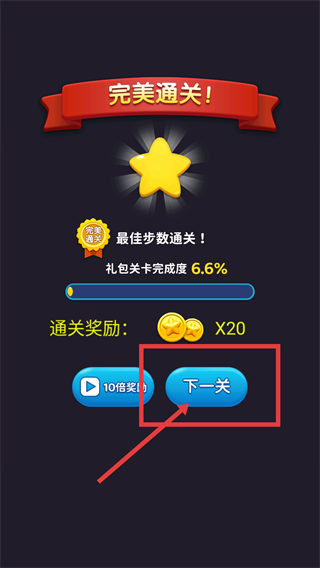 4、通關(guān)后獲得【完美通關(guān)】標識,獲得【X20】的通關(guān)獎勵,按指引點擊【下一關(guān)】按鈕,進入后續(xù)的關(guān)卡挑戰(zhàn)。