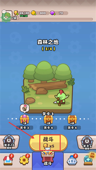 1、在【森林之地-3/4】界面,消耗【5-閃電】點(diǎn)擊【戰(zhàn)斗】按鈕,開(kāi)啟對(duì)應(yīng)關(guān)卡的挑戰(zhàn),推進(jìn)關(guān)卡進(jìn)度。